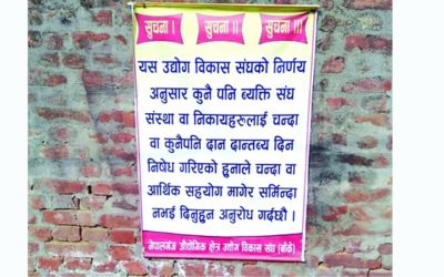 काठमाडौँ, १५ मंसिर । नेपालगञ्जस्थित औद्योगिक क्षेत्रका उद्योगी व्यवसायीसँग चन्दा र दान मागेर हैरान पारिएपछि