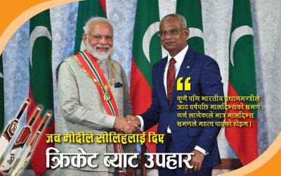 भारतीय प्रधानमन्त्री नरेन्द्र मोदीले मालदिभ्सका राष्ट्रपति इब्राहिम मोहमद सोलिहसँगको भेटमा क्रिकेट ब्याट उपहार दिए ।