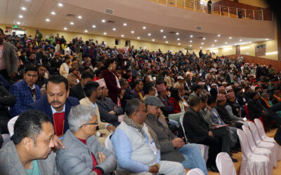 काठमाडौँ,८ पुष । सुर्खेतको वीरेन्द्रनगरमा आयोजना गरिएको नेपाल पत्रकार महासङ्घको केन्द्रीय साधारणसभामा सहभागीहरु । तस्बिरः