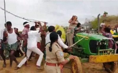 महिला वन अधिकृतलाई गाउँलेले लाठीले कुटिरहेका छन्, प्रहरी मुकदर्शक छ । ट्याक्टरको माथि बसेकी महिलाले