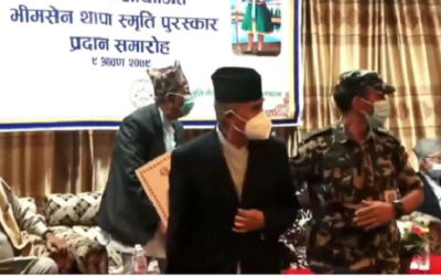काठमाडौं, ९ साउन । भीमसेन थापा स्मृति पुरस्कार प्रदान गरेपछि प्रमुख अतिथिका रुपमा प्रधानमन्त्री शेरबहादुर