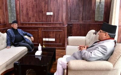 काठमाडौं, २३ बैशाख । नेकपा (एमाले) का अध्यक्ष केपी शर्मा ओली प्रधानमन्त्री पुष्पकमल दाहालसँग भेटवार्तामा